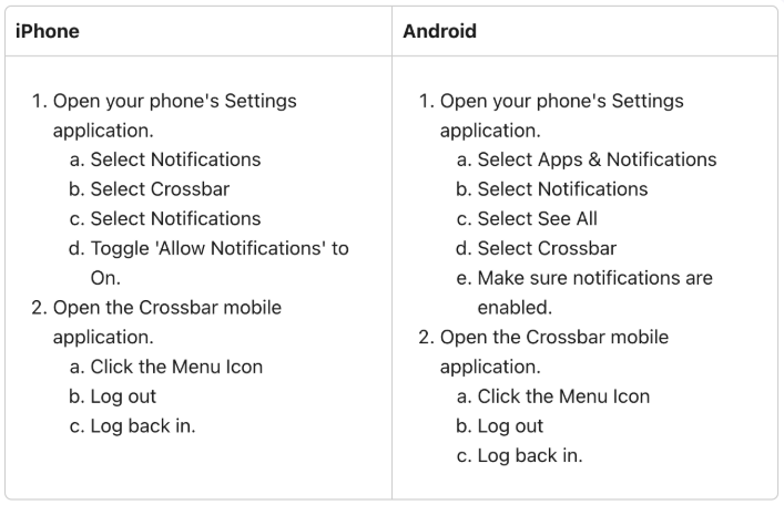 Follow the device-specific instructions below to ensure that notification settings are correct. Once completed, log out and back into the Crossbar application even if you did not change. Contact Crossbar support if you still do not receive notifications.